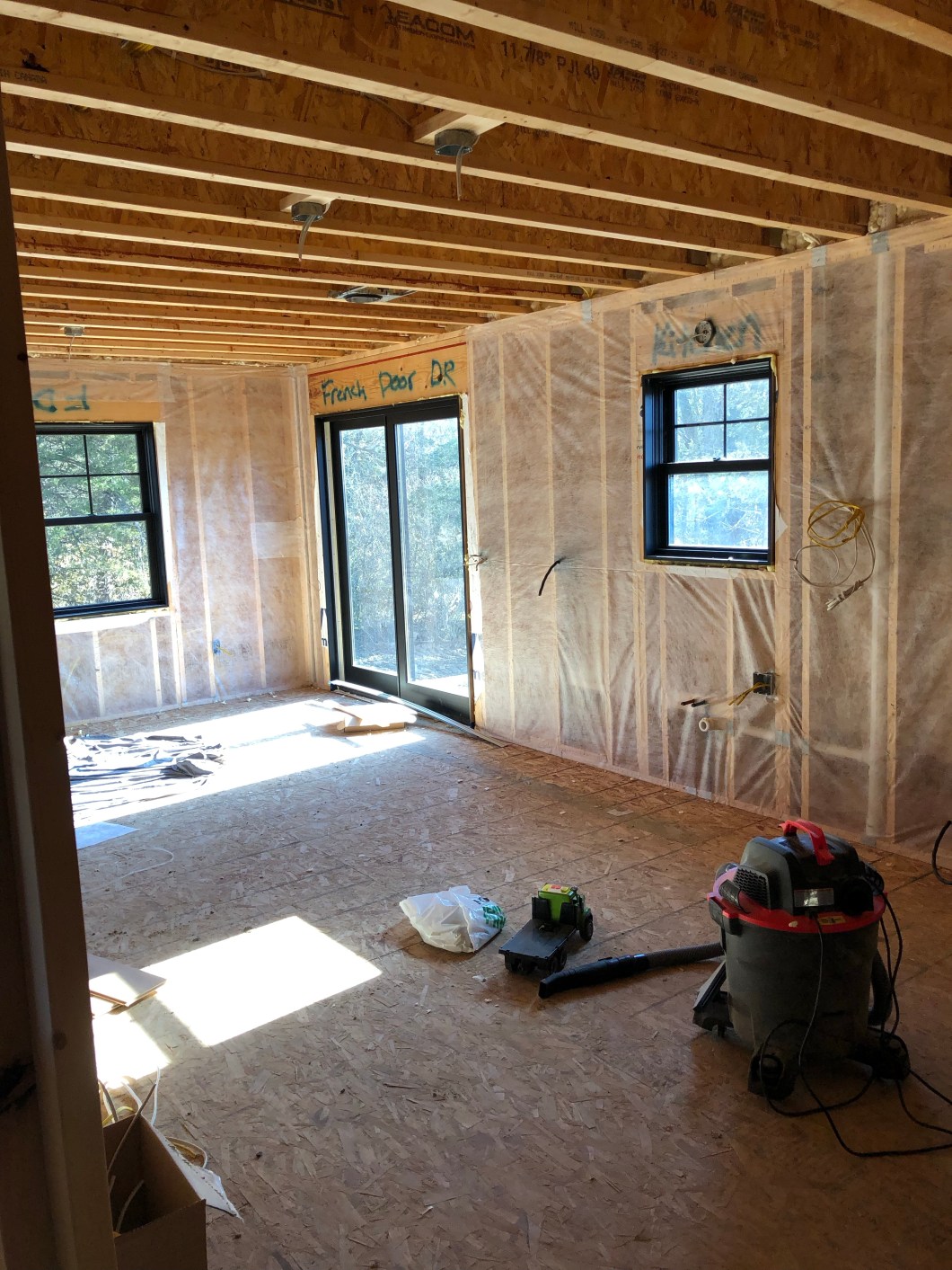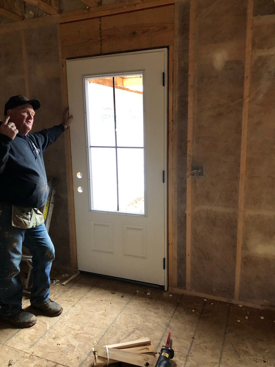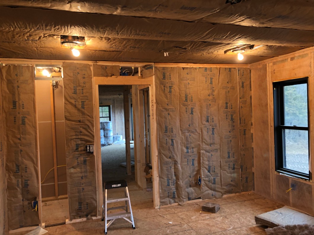 November 21: Kyle and Rusty got things ready for insulation, installed all the exterior doors, Kyle started hooking up electrical switches and outlets, I put in all the lightbulbs and hung batt insulation in interior walls.