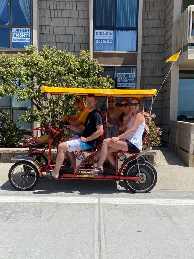 After we ate all that we headed back and got ready for the beach. The water was really cold but Brett was out there with the boogie board, we dug a big hole, and just enjoyed sitting by the beach and people watching. We rented a 6 person bike for an hour and had so much fun and so many laughs riding up and back the road on it. When we were done doing that we went to find a quick lunch so that we could get back to the condo and get ready for the wedding. We walked up to the downtown and they all got Mexican and me and Kyle got a good Hawaiian Pizza at a place called Knockout Pizza. We stopped in a souvenir place and We found a mug like we do at every vacation and me and anna got the comfiest long sleeve shirts ever.