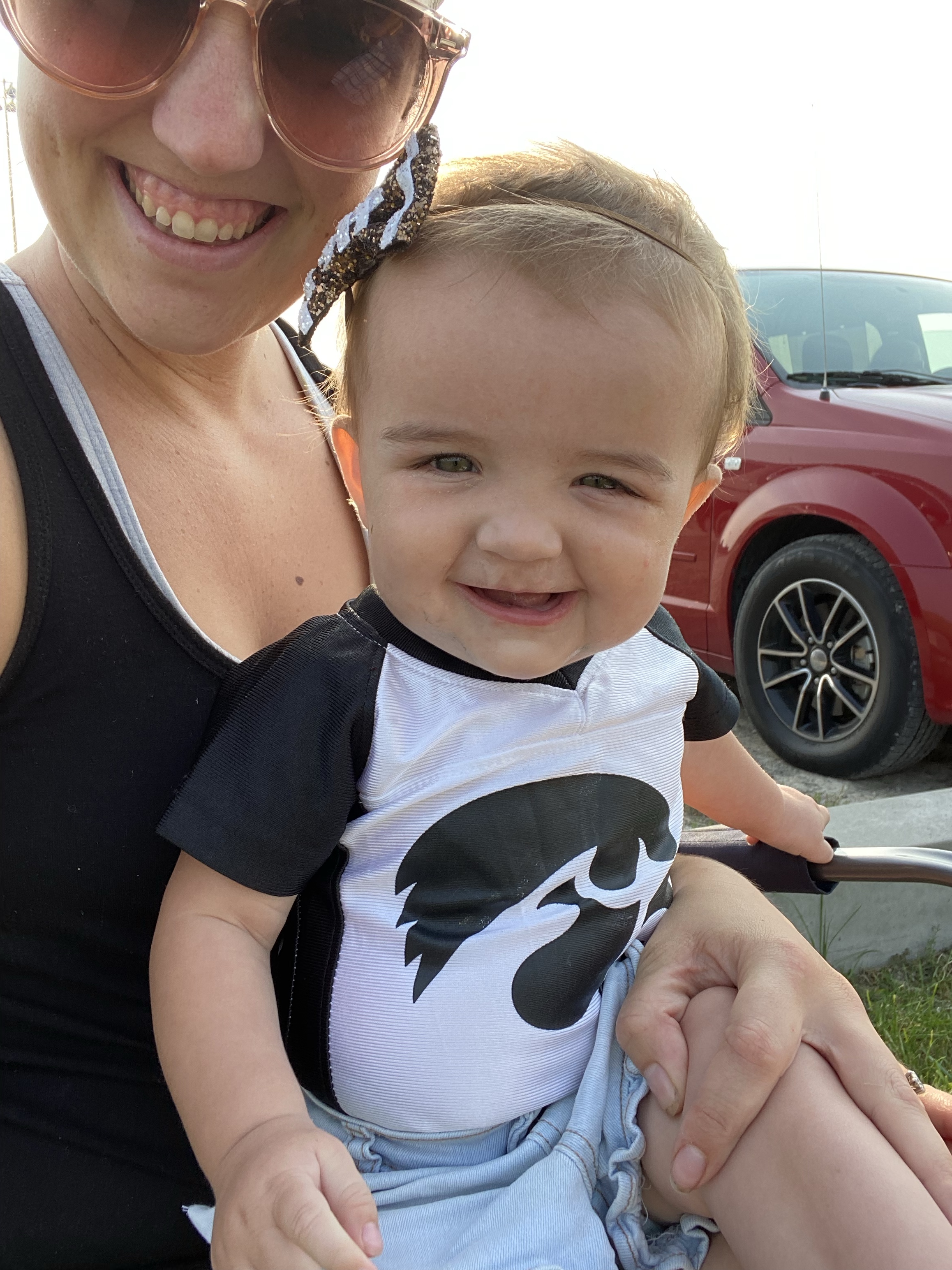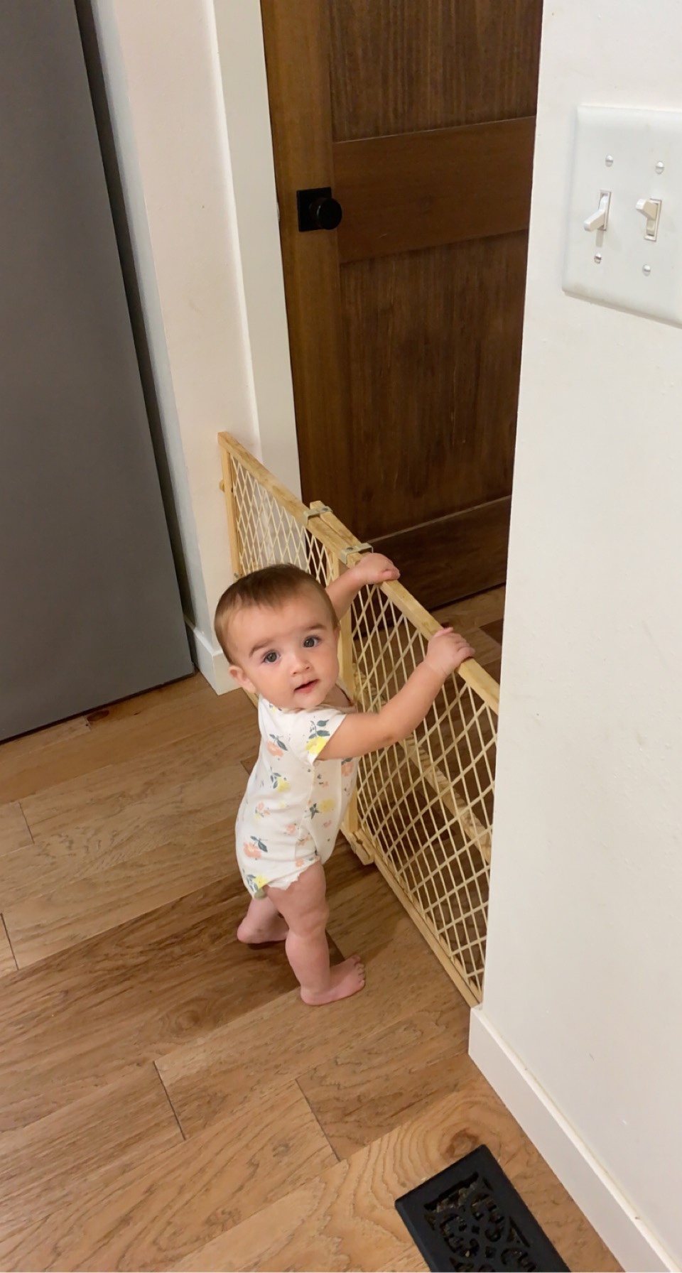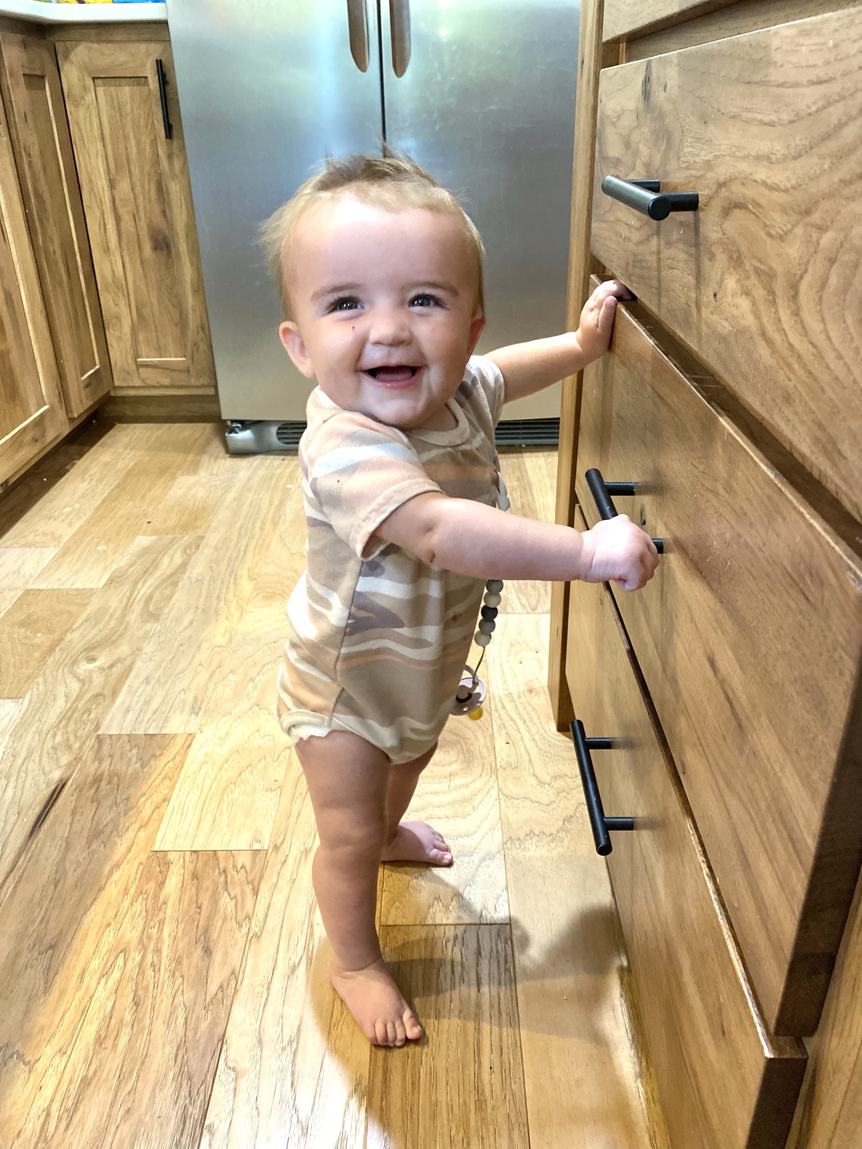 Development – girlfriend you are crazy. you have a weird crawl where you drag the leg but it doesn’t stop you at all from getting anywhere FAST. you are quick and quiet. You pull yourself up everything! and then cant get down. every toy, in your bed, on mom and dad. you never sit still. You can stand by yourself too and loving being in the walker outside on the concrete. You LOVE playing with your brothers and are happiest if you all three are playing in the living room together. Whenever her daddy holds her in his arm she does the cutest little one leg kicking thing.