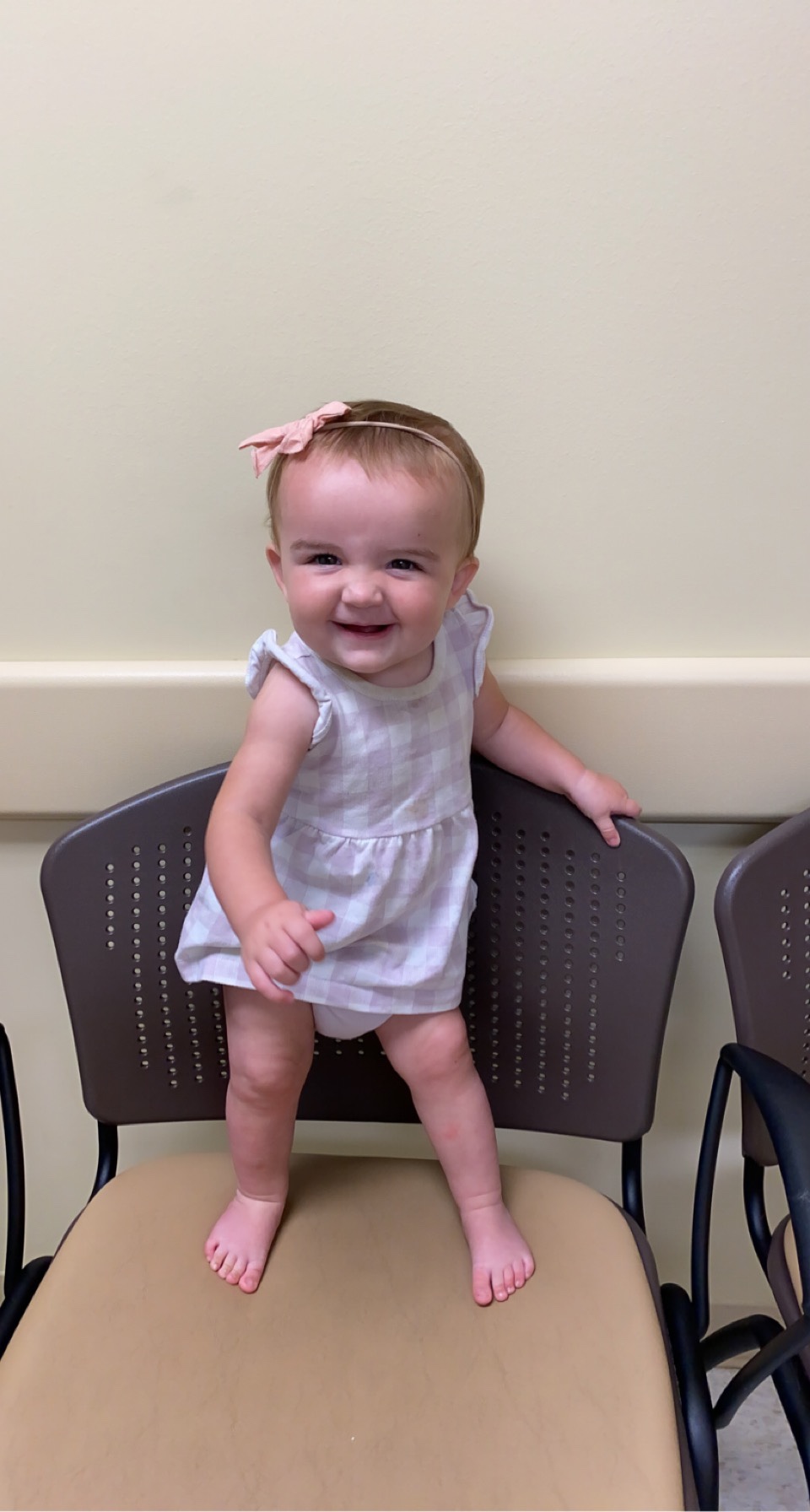 wearing 6-9 and 9 months clothing. need to get some more bigger pajamas out because she is so long. love dressing her up and she has been wearing shoes a lot too. hair is getting very long and growing well and consitent everywhere and ive trimmed it a little so it is uniform. still leaves her bows in which is awesome! her eyes are turning more of a green/brown, and her hair is still a light brown.