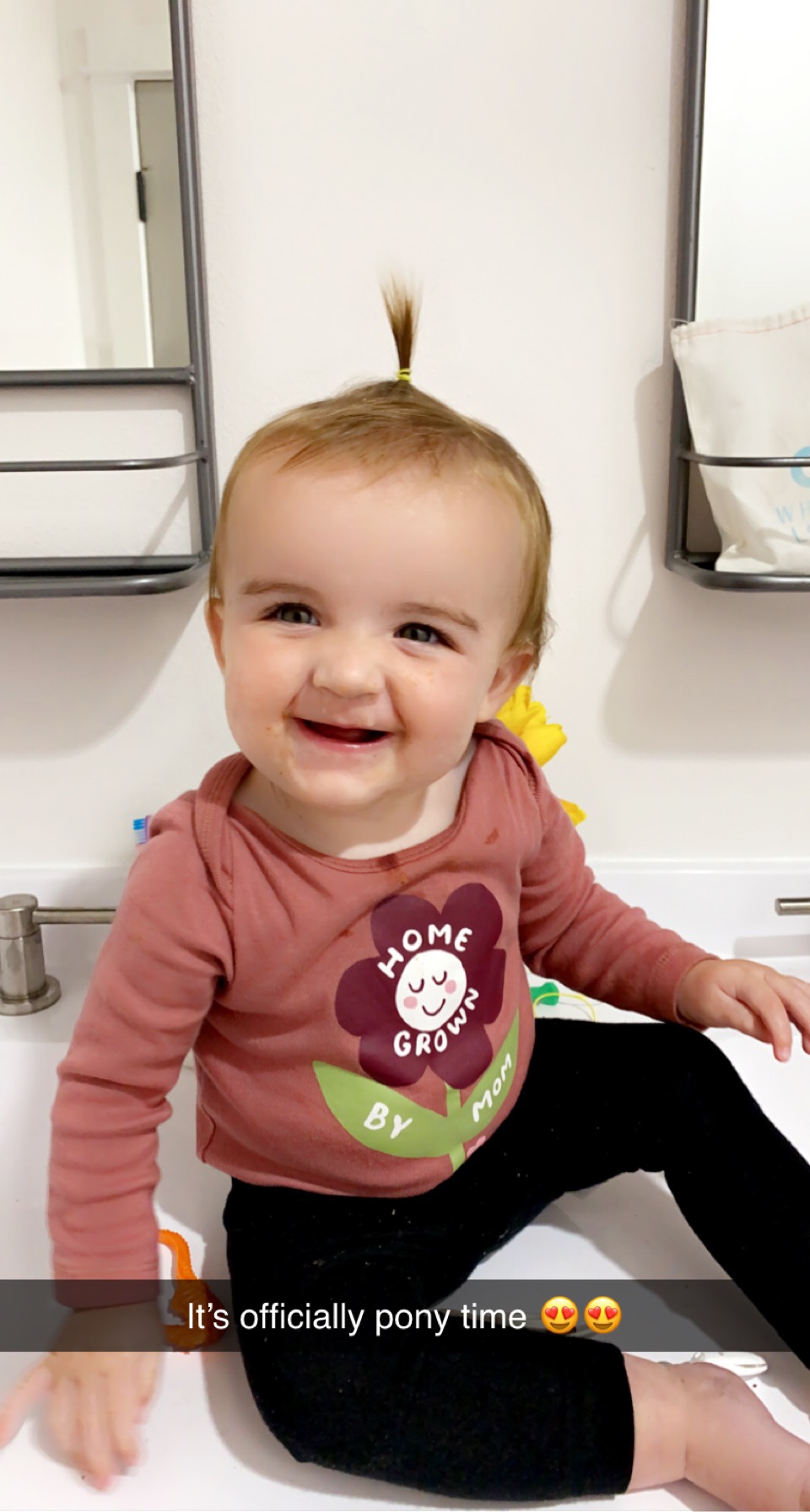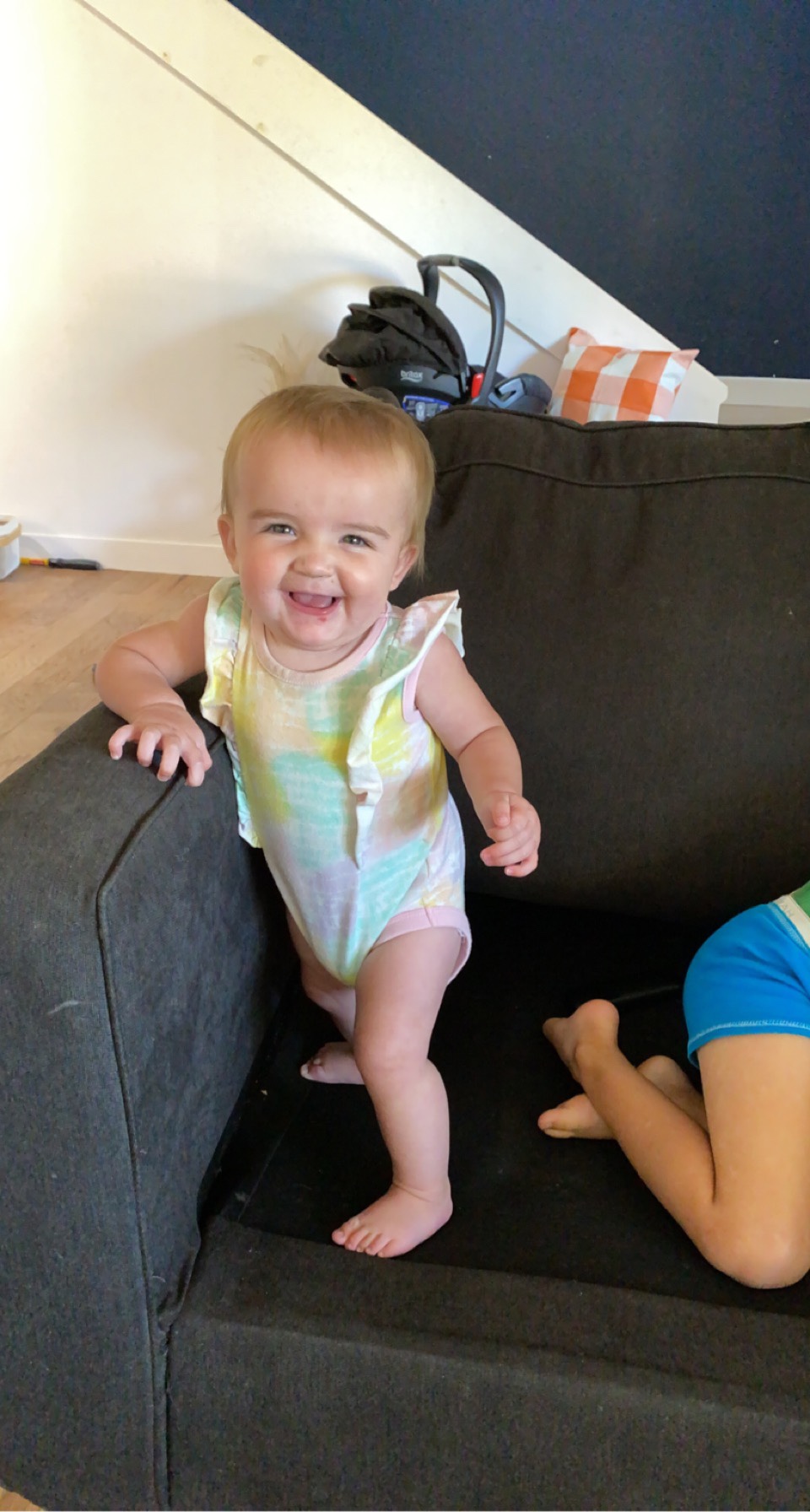 Everything still goes in the mouth and I spend my whole day digging things out. Can easily climb up all the stairs and if left in the living room she sprints over to it. Has figured out how to et around the bench that I put in front of it. Now stands in her high chair and was caught once trying to get the remote off of the table next to the high chair. She wants to be roaming and free all the time. doesn’t like being stuck in one room or put in the exersaucer. She loves and adores her brothers and wants to be playing with them, runs around in her walker outside. LOVES riding the boys 4 wheeler and playing downstairs. Still crawls weird and is all over the place so fast.