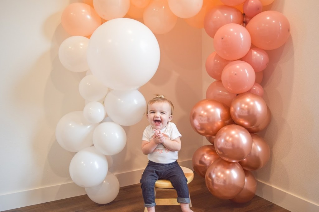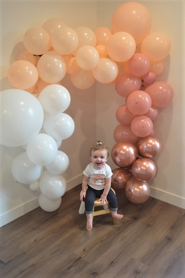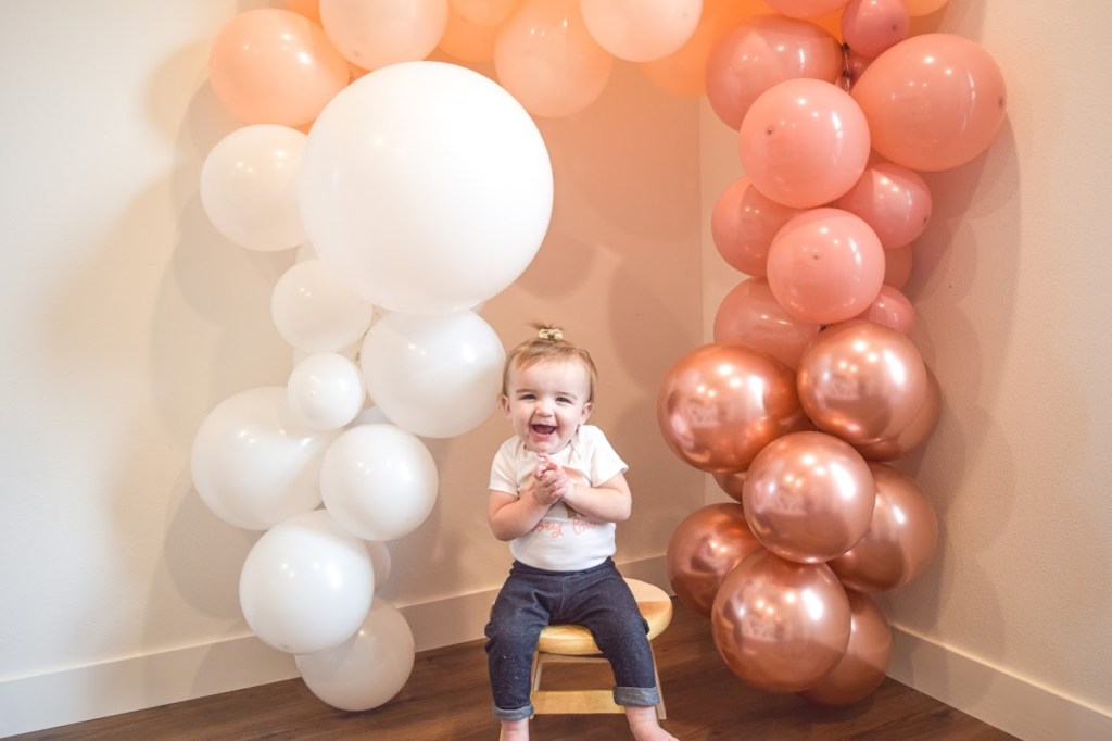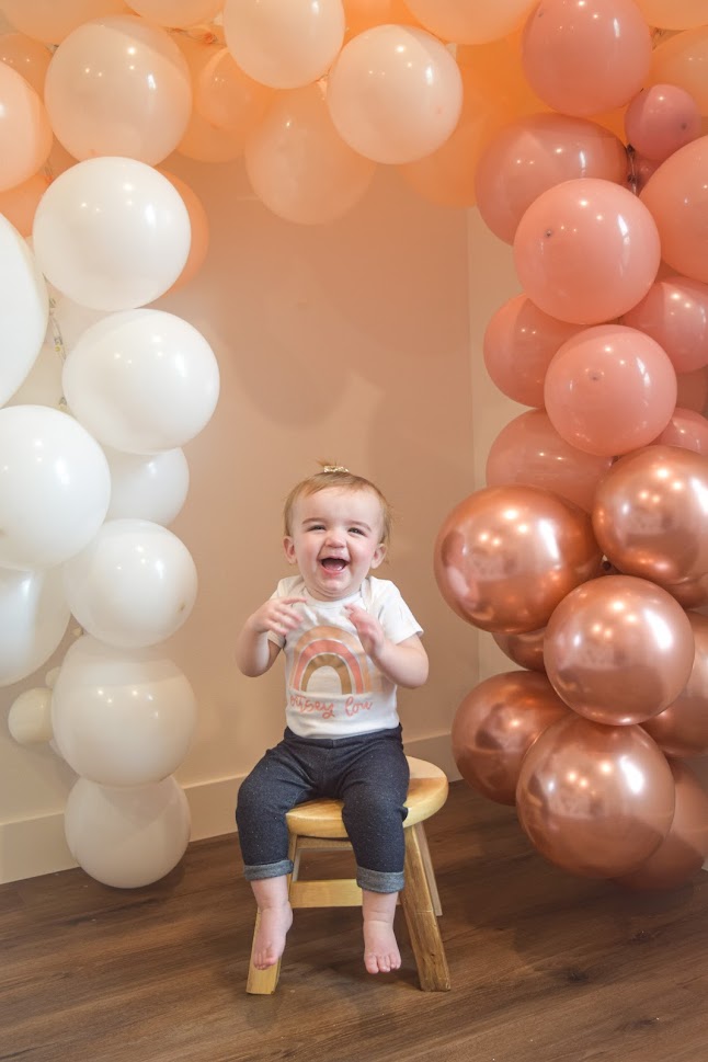 Aunt Momo had a few days she was on break so she came over and helped with pics. i am glad she did because our two minds came up with the cutest little picture set up! We used her balloon arch and her birthday shirt. She wasnt in the best of moods but i love them!