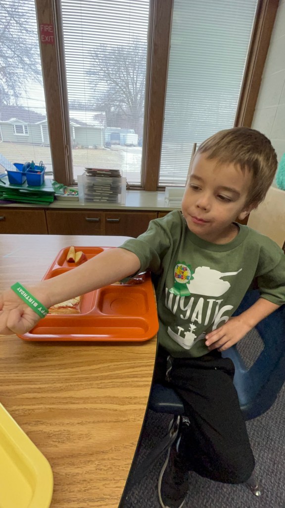Wyatt had lots of celebrating for his birthday! The day before his birthday, he got to bring donut holes for his class treat, mom went and ate lunch at school with him, and he got to have Jack and Clay over to play after school.
